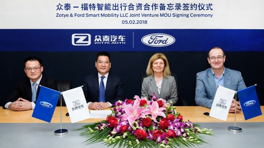 SHANGHAI, May 2, 2018 – Ford Smart Mobility LLC and Zotye Auto today signed an MOU to establish a new 50:50 JV that will focus on providing smart, customized all-electric vehicle solutions to fleet operators and drivers in China’s fast-growing ride-hailing market. Ford Smart Mobility LLC is a Ford Motor Company subsidiary formed to design, build, grow and invest in emerging mobility services.