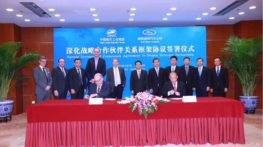 2017年12月7日,中国北京 — 中国南方工业集团公司与福特汽车公司在北京签署了深化战略合作伙伴关系框架协议,协议就长安汽车和福特汽车双方在产品、销售、采购、研发、新兴业务等领域达成了进一步深入合作的一致约定,实现合作伙伴关系的战略转型和升级。中国南方工业集团公司董事长徐平与福特汽车公司总裁兼首席执行官韩恺特(Jim Hackett)代表双方签署了协议。