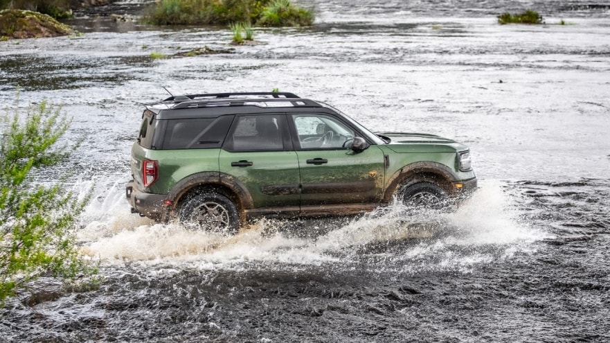 • Só atravesse trechos alagados se a água estiver até a altura do meio da roda. A F-150 e o Bronco Sport, por exemplo, podem rodar em até 60 cm de profundidade de água. Já a Ranger encara até 80 cm de profundidade e a Ranger Raptor, até 85 cm.